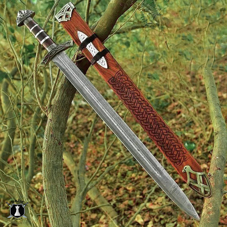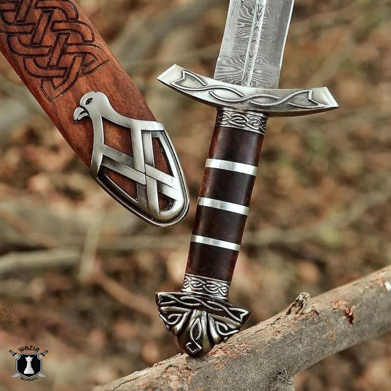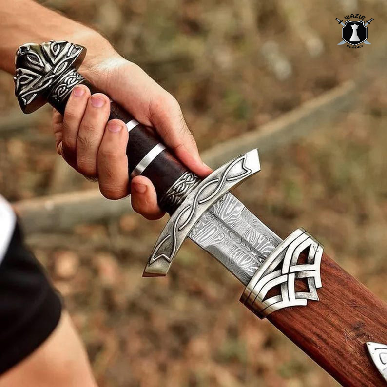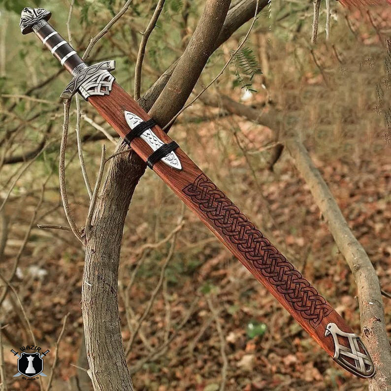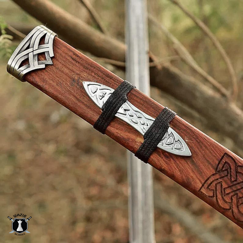 One of the standout features of this sword is its custom-designed wooden sheath. Made from finely carved wood, the sheath includes traditional Norse knotwork patterns, reflecting Viking-era artistry. The scabbard also features: