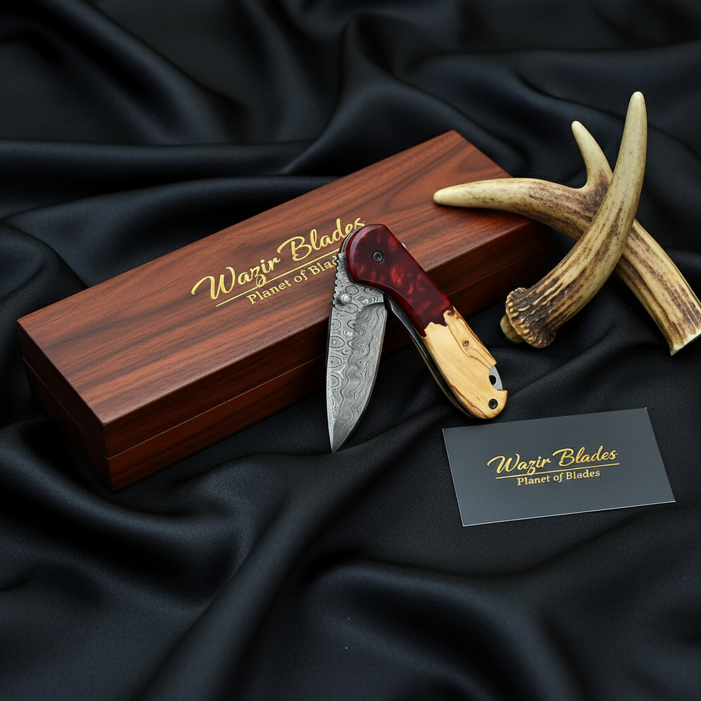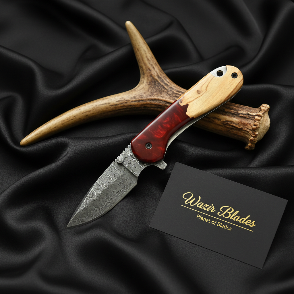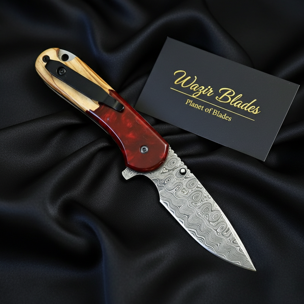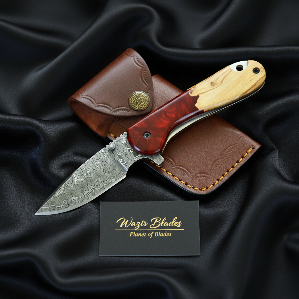Handmade Damascus Folding Knife – Resin & Wood Handle EDC Pocket Knife