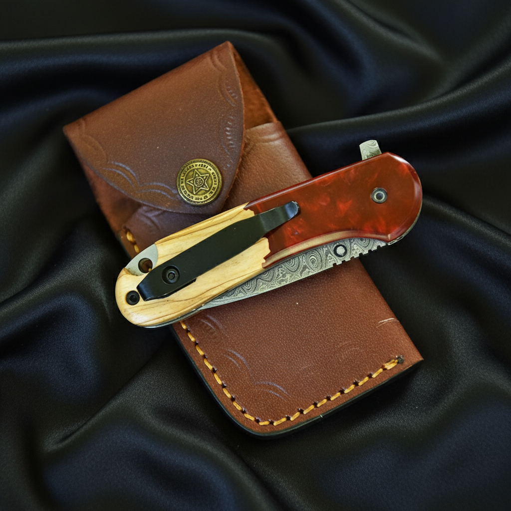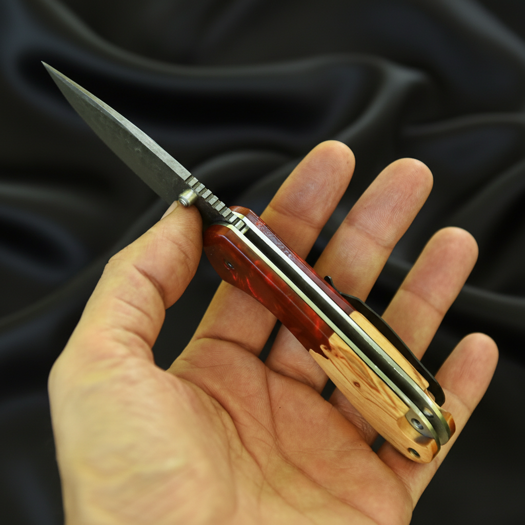 The resin & wood handle provides a striking visual appeal while ensuring a comfortable, secure grip. Each handle is handcrafted, meaning no two knives are exactly alike. The smooth folding mechanism allows for easy one-hand operation, making it a reliable EDC pocket knife for everyday use.