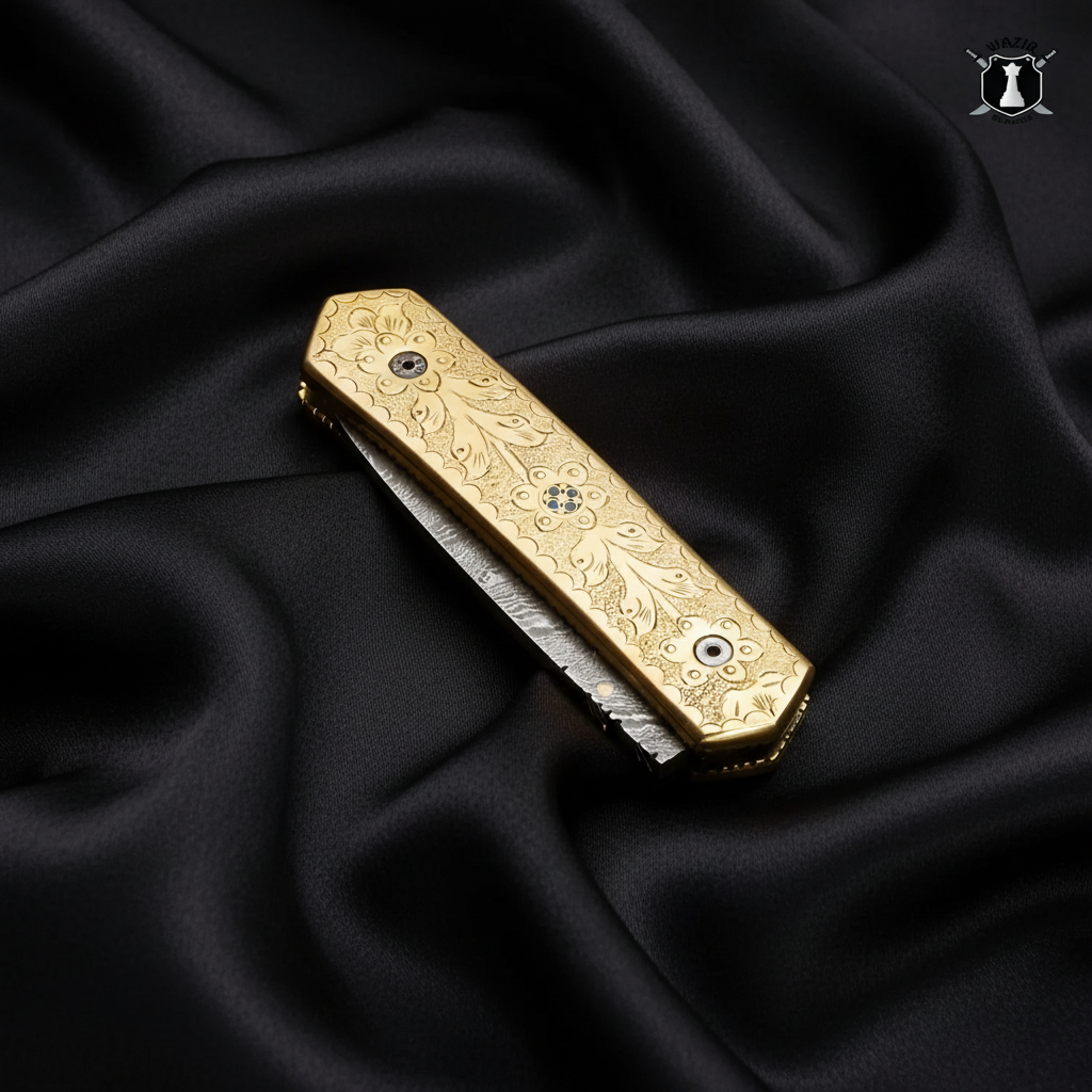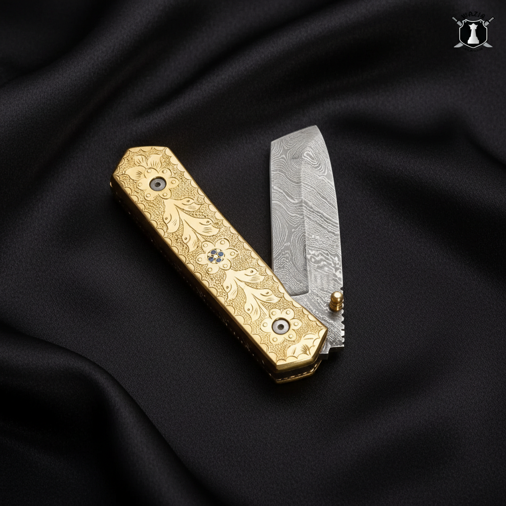 Elevate your collection with the exquisite beauty of our Handmade Damascus Pocket Knife’s brass engraved handle. Intricately designed and expertly crafted, the handle features stunning engravings that add a touch of sophistication to the overall aesthetic. Not only does it provide a comfortable grip, but it also serves as a testament to the artisanal skill and attention to detail that goes into each knife. Whether displayed in a collection or carried for everyday use, the brass handle makes a bold statement of style and craftsmanship.