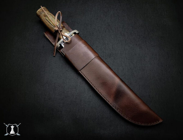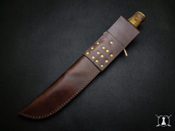 To complete the package, the knife comes with a custom-fitted premium leather sheath. The sheath is hand-stitched, designed to fit snugly around the blade, and includes a belt loop for convenient carry. The combination of polished steel, natural wood, and quality leather gives this knife a commanding presence that is impossible to ignore.