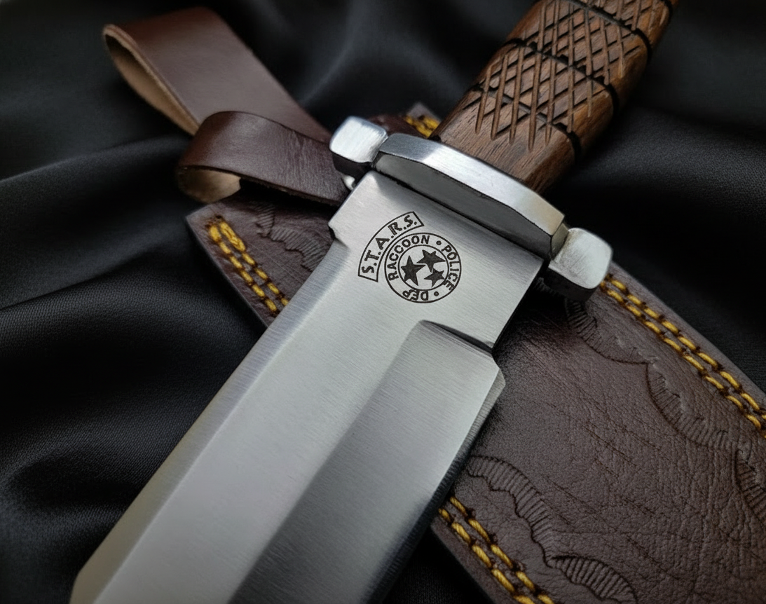 Step into the world of Resident Evil with this Raccoon City Police Knife, a beautifully handcrafted replica inspired by the iconic weapons carried by the elite R.P.D. officers. Built from durable stainless steel and paired with a solid wood handle, this knife combines authentic game-inspired design with premium craftsmanship — perfect for collectors, fans, and cosplay enthusiasts.
