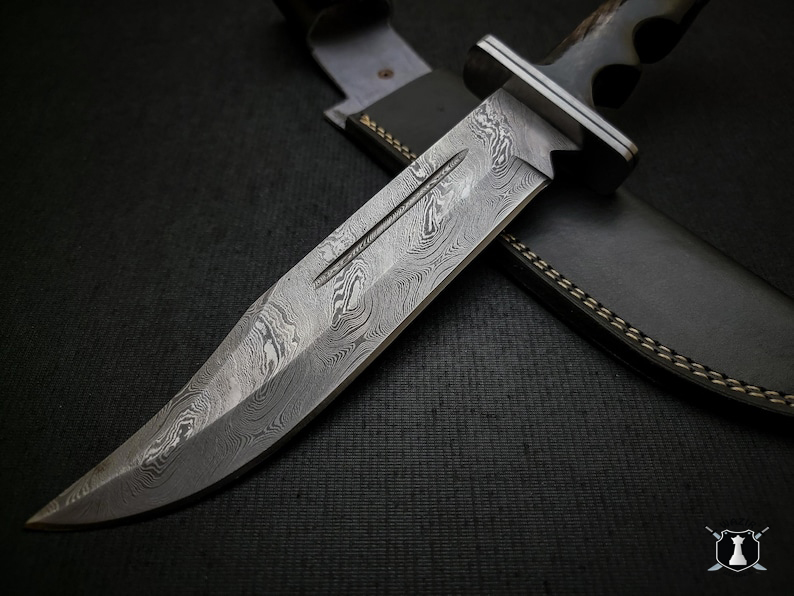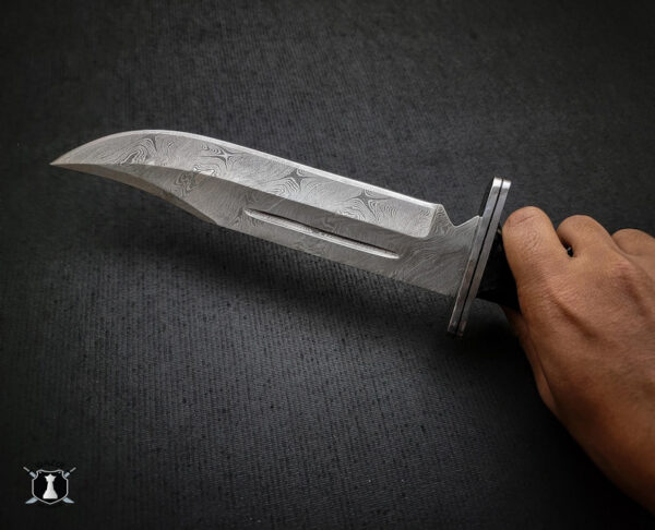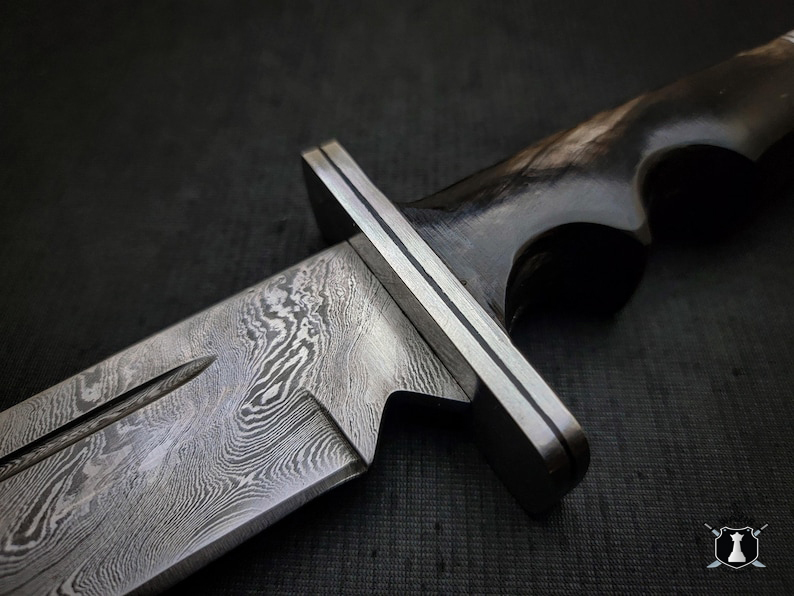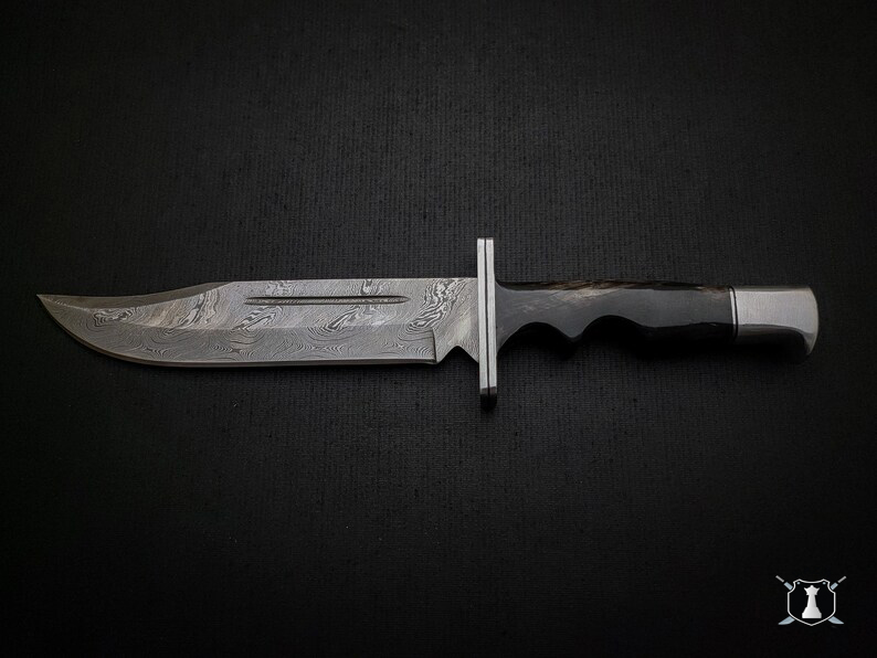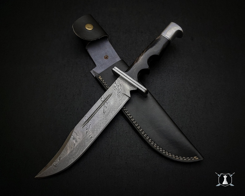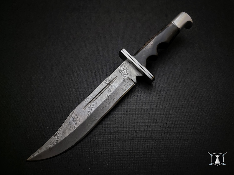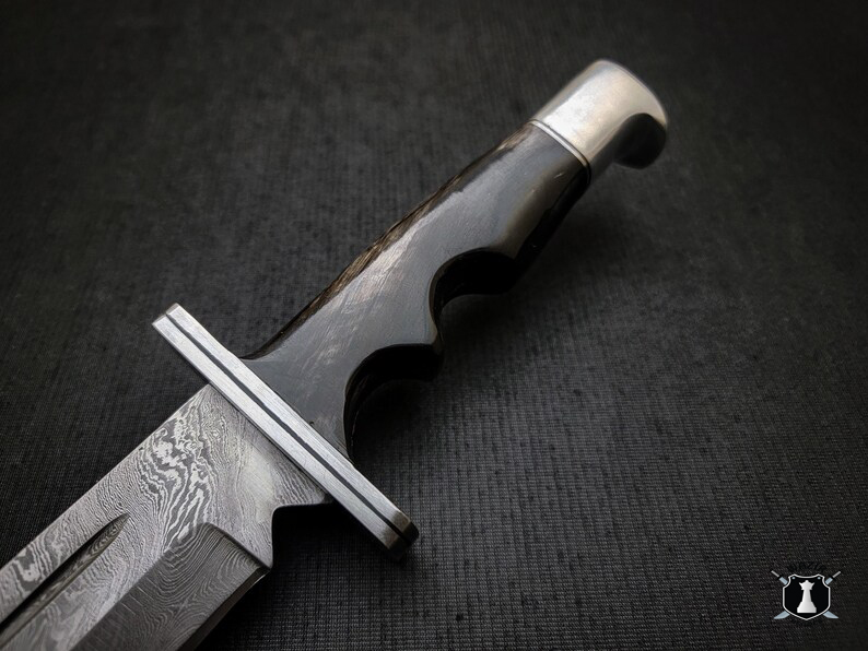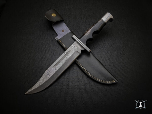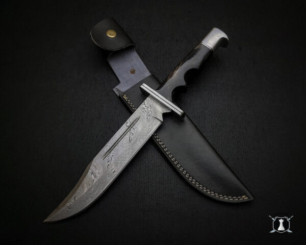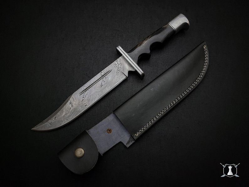 This full-sized replica is handcrafted with a Damascus steel blade and a durable bull horn handle, offering both authenticity and a premium feel. It includes a hand-stitched leather sheath, allowing you to display or carry it safely.